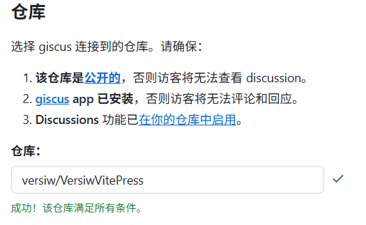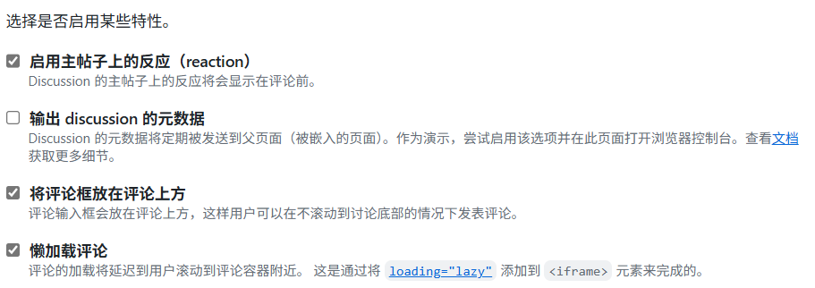 访问 giscus,进行 giscus 的在线配置,按要求输入仓库,可以检查仓库是否满足 giscus 开启条件,根据页面引导完成配置,下方底部会给出生成好的 <script> 标签