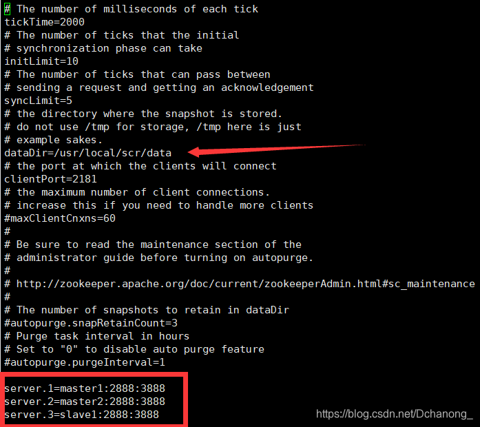 vi zoo.cfg将 zoo.cfg 文件中的dataDir路径指向之前的data路径,并在最后添加zookeeper集群配置