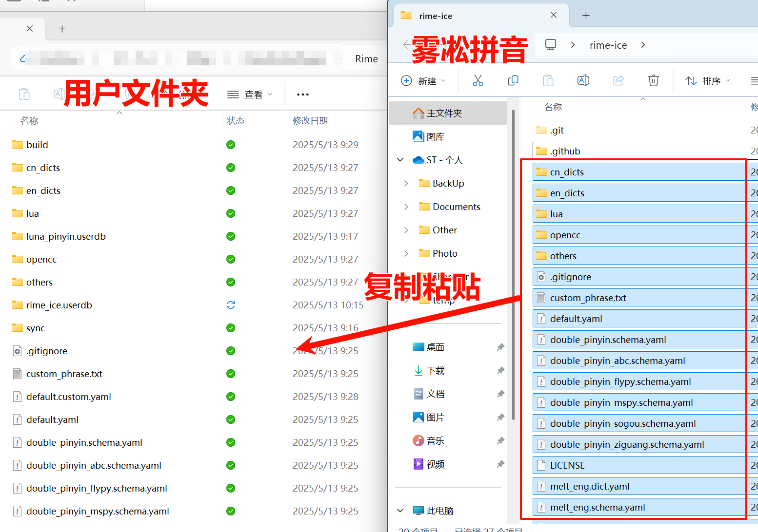 将项目文件夹下除了 .git.github 外的所有文件复制粘贴到 Rime 用户文件夹下。